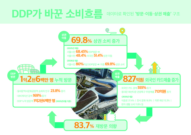 서울디자인재단은 동대문디자인플라자 방문객의 69.8%가 인근 동대문 상권에서 소비한 것으로 나타났으며, 유동인구와 매출 증가가 수년간 이어지는 등 DDP가 지역경제 활성화의 핵심 거점으로 자리 잡았다고 밝혔다.
