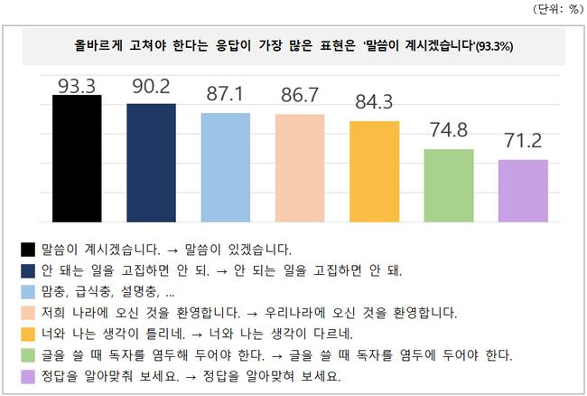 특히 30개 항목 중 13개는 개선 필요성 응답이 70% 이상, 5개 항목은 80% 이상으로 나타나 바르고 쉬운 공공언어에 대한 공감대가 확인됐다. 가장 높은 개선 요구를 받은 표현은 ‘그 제품은 품절이십니다’, ‘커피 나오셨습니다’ 등 과도한 높임 표현으로, 응답자의 93.3%가 고쳐야 한다고 답했다.